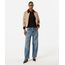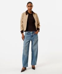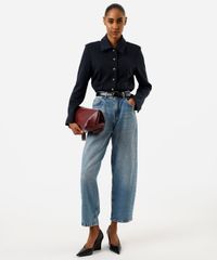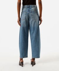 Calça feminina confeccionada em jeans com elasticidade. A peça tem a modelagem baggy, com construção afunilada e o caimento solto ao corpo. O modelo tem cintura alta, cós com passantes para cinto e fechamento por botão e zíper. Possui três bolsos na parte frontal e dois aplicados na parte posterior. Detalhe de acabamento em pesponto contrastante.