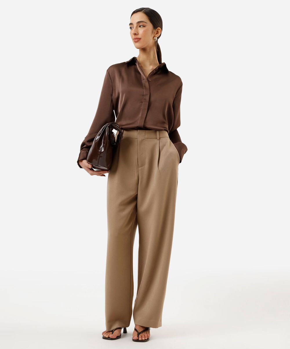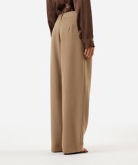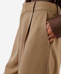 Calça de alfaiataria feminina confeccionada em tecido plano com viscose. A peça tem a modelagem balloon, com construção afunilada e o caimento amplo e solto ao corpo. O modelo tem cintura alta, cós com passantes para cinto, pregas frontais e fechamento por botão e zíper. Possui dois bolsos na parte frontal e acabamento pespontado nas barras.