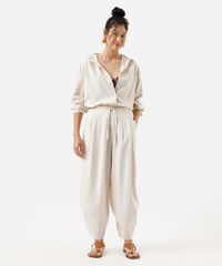 calça balloon feminina com linho e pregas cós elástico bege