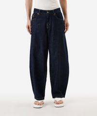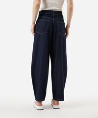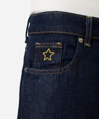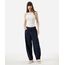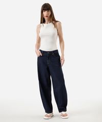 Calça feminina confeccionada em jeans. A peça tem a modelagem balloon, com construção afunilada e o caimento solto ao corpo. O modelo tem cintura baixa, cós com passantes para cinto e fechamento frontal por botão e zíper. Possui três bolsos na parte frontal e dois aplicados na parte posterior. Detalhe de acabamento em pesponto contrastante e bordado de estrela.