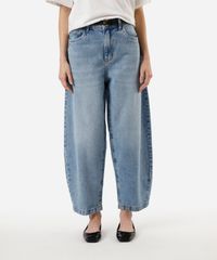 Calça feminina confeccionada em jeans com. A peça tem modelagem balloon, com construção afunilada e caimento solto ao corpo. O modelo tem cintura média, cós com passantes para cinto e fechamento por zíper e botão. Possui três bolsos frontais e dois aplicados na parte posterior. Detalhe de acabamento em pesponto contrastante.
