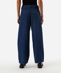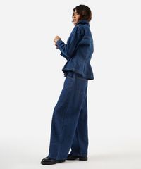 Calça feminina confeccionada em jeans. A peça tem a modelagem balloon, com construção reta e caimento solto ao corpo. O modelo tem cintura média, cós com passantes para cinto e fechamento frontal por botão e zíper. Possui dois bolsos na parte frontal e dois aplicados na parte posterior. Detalhe de acabamento pespontado nas barras.