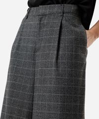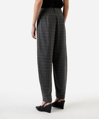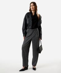 Calça de alfaiataria feminina confeccionada em tecido plano com padronagem xadrez. A peça tem a modelagem barrel, com construção afunilada e caimento amplo e solto ao corpo. O modelo tem cintura alta, pregas frontais, cós com passantes para cinto e fechamento por botão e zíper. Possui dois bolsos na parte frontal e acabamento com pesponto nas barras.