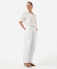 Calça feminina confeccionada em sarja. A peça tem a modelagem barrel, com construção afunilada, caimento é confortavelmente solto ao corpo com recortes laterais e bordados vazados. O modelo tem cintura alta, cós com passantes para cinto e fechamento frontal por botão e zíper. Possui três bolsos na parte frontal e dois aplicados na parte posterior. Detalhe de acabamento pespontado nas barras.