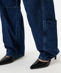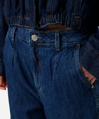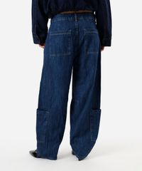 Calça feminina confeccionada em jeans. A peça tem a modelagem barrel, com corte afunilado e o caimento amplo e solto ao corpo. O modelo tem cintura média, cós com passantes para cinto e fechamento por botão e zíper. Possui dois bolsos faca na parte frontal, dois bolsos deslocados laterais e dois aplicados na parte posterior. Possui pences na altura dos joelhos e acabamento em pesponto contrastante.