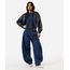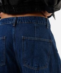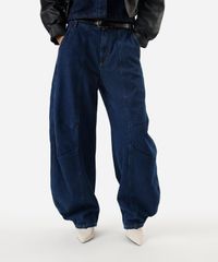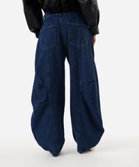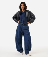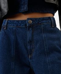 Calça feminina confeccionada em jeans com lavagem escura. A peça possui modelo barrel, cintura média, cós com passantes aplicados, bolsos frontais e posteriores, pernas ampla e curva, barra afunilada, detalhe de recortes, caimento reto, acabamento pespontado e fechamento frontal por zíper e botão.