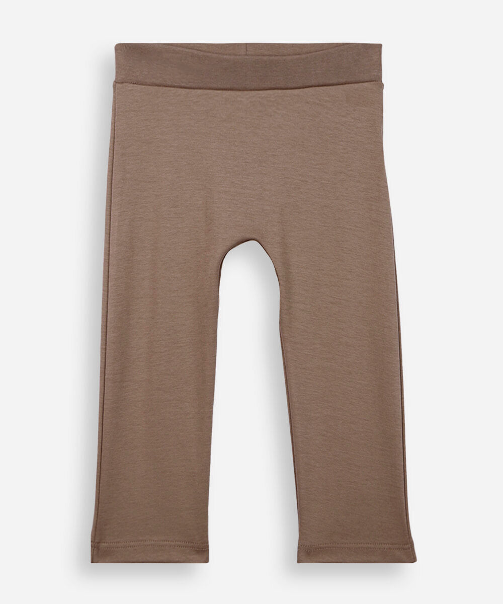 Calça infantil confeccionada em malha de algodão. A peça tem a modelagem e construção reta e o caimento é levemente solto ao corpo. O modelo tem cintura alta e cós com elástico embutido. Detalhe de acabamento pespontado nas barras.
