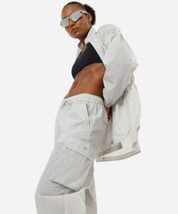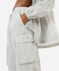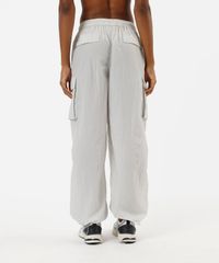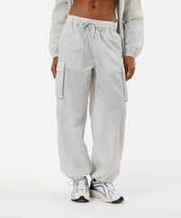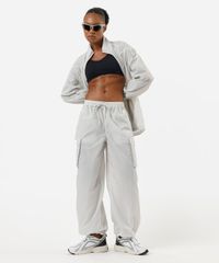 Calça esportiva feminina confeccionada em tecido plano de poliamida. A peça tem a modelagem cargo, com construção reta e o caimento solto ao corpo. O modelo tem cintura média, cós com elástico embutido e cordão para ajuste. Possui dois bolsos na parte frontal, dois utilitários laterais e dois decorativos na parte posterior. Possui elástico embutido nas barras com regulador de abertura.