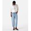 Calça feminina confeccionada em jeans. A peça tem a modelagem cenoura, com construção afunilada, caimento confortavelmente solto ao corpo e comprimento cropped. O modelo tem cintura alta, cós com passantes para cinto e fechamento frontal por botão e zíper. Possui três bolsos na parte frontal e dois aplicados na parte posterior. Detalhe de acabamento pespontado nas barras.