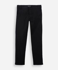 Calça infantil confeccionada em sarja com elasticidade. A peça tem a modelagem chino, com construção reta e o caimento é levemente solto ao corpo. O modelo tem cintura média, cós com passantes para cinto e fechamento frontal por botão e zíper. Possui dois bolsos na parte frontal e dois embutidos decorativos na parte posterior. Detalhe de acabamento pespontado nas barras.