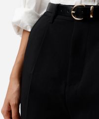 Calça de alfaiataria feminina confeccionada em tecido plano com viscose. A peça tem a modelagem afunilada e o caimento é confortavelmente solto ao corpo. O modelo tem cintura alta, cós com passantes para cinto, pregas frontais e fechamento por botão e zíper. Possui dois bolsos na parte frontal, acabamento pespontado nas barras e acompanha um cinto em material sintético.
