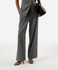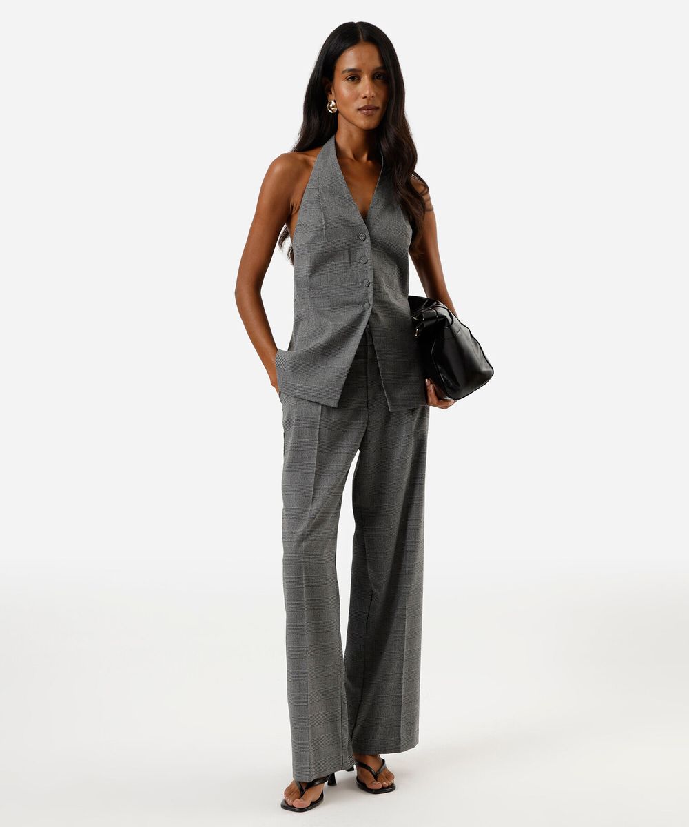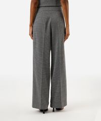 Calça de alfaiataria feminina confeccionada em tecido plano com padronagem xadrez. A peça tem a modelagem e construção reta e o caimento é solto ao corpo. O modelo tem cintura alta, cós liso, pregas frontais e fechamento por botão e zíper. Possui dois bolsos na parte frontal e acabamento pespontado nas barras.