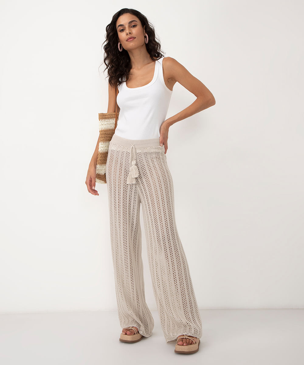 Perfeita para os dias de sol, esta calça pantalona em crochê combina o charme do trabalho artesanal com um design moderno e fluido. Sua modelagem ampla proporciona conforto e um caimento leve, ideal para criar looks de praia sofisticados e descontraídos. Uma peça versátil que transita com elegância da areia para um passeio ao entardecer.