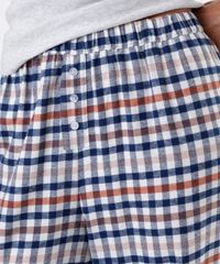 Calça de pijama feminina confeccionada em tecido plano de algodão com estampa xadrez. A peça tem modelagem reta e caimento solto ao corpo. O modelo tem cintura média, cós com elástico embutido e botões decorativos.