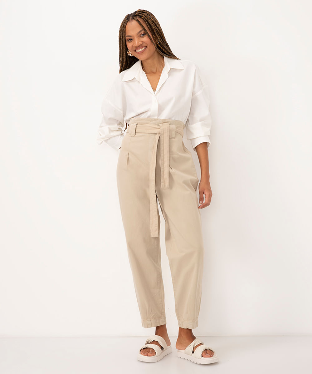 Renove seu estilo com esta calça de sarja feminina, uma peça que combina conforto e um design moderno. Com modelagem carrot e cintura super alta, ela oferece um visual elegante e despojado. Confeccionada em tecido 100% algodão, seu toque macio e caimento impecável a tornam a escolha ideal para compor looks versáteis, do casual ao mais arrumado.