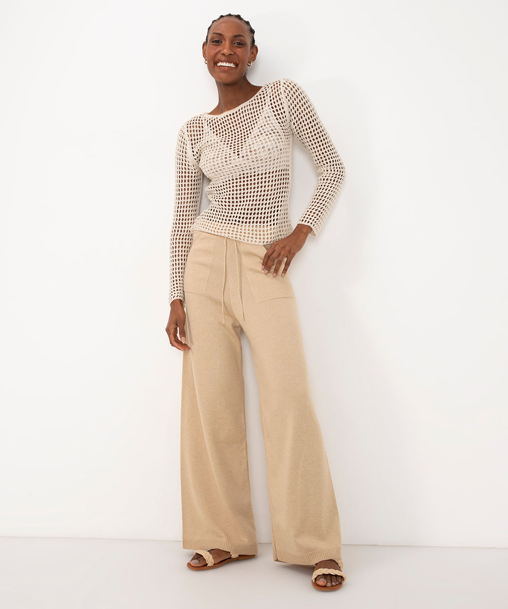 Calça confeccionada em tricot de trama trançada. Possui modelagem wide leg, cós largo com cordão para ajuste e amarração, dois bolsos frontais, caimento reto e acabamento de barra em canelado.