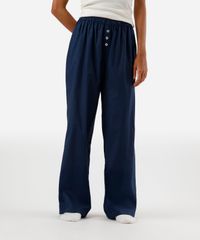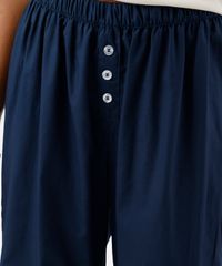 Calça feminina de pijama confeccionada em tecido plano de algodão. A peça possui cintura alta, cós elástico, botões decorativos na parte frontal, caimento reto e levemente solto ao corpo e acabamento pespontado. Composição: 100% algodão Modelo veste: P/38 Medidas da modelo: Altura: 1,74m Busto: 79cm Cintura: 66cm Quadril: 102cm Instruções de lavagem: - Temperatura até 40º - Não alvejar - Não secar em secadora - Secar na vertical - Passar em temperatura média - lavar à seco