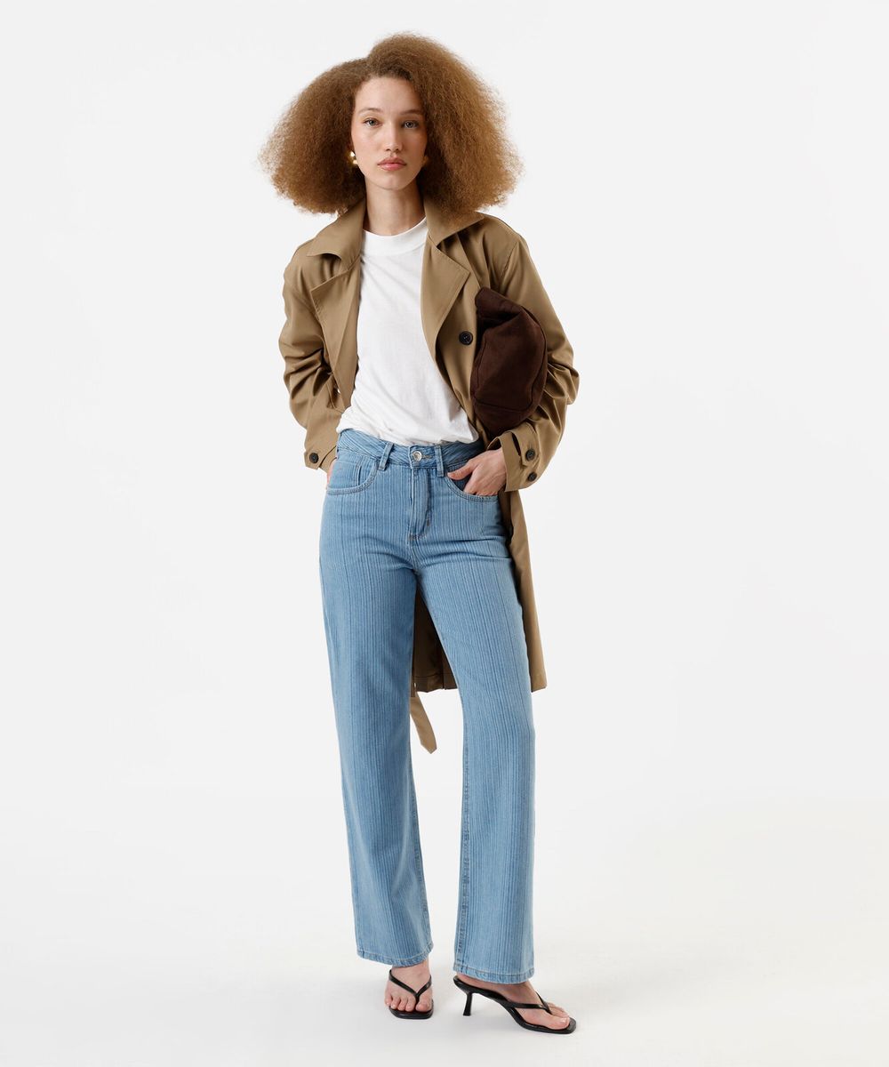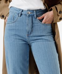 Calça feminina confeccionada em jeans com padronagem listrada. A peça tem a modelagem wide leg, com construção reta e caimento solto ao corpo. O modelo tem cintura média, cós com passantes para cinto e fechamento por botão e zíper. Possui três bolsos na parte frontal, dois aplicados na parte posterior, barra e quadril levemente amplos e acabamento pespontado nas barras. Composição: 100% algodão Modelo veste: P/38 Medidas da modelo: Altura: 1,75m Busto 80cm Cintura: 60cm Quadril: 93cm Instruções de lavagem: - Temperatura até 40° - Não alvejar - Secar em secadora - Secar na vertical - Passar em temperatura média - lavar à seco - Não limpar à úmido