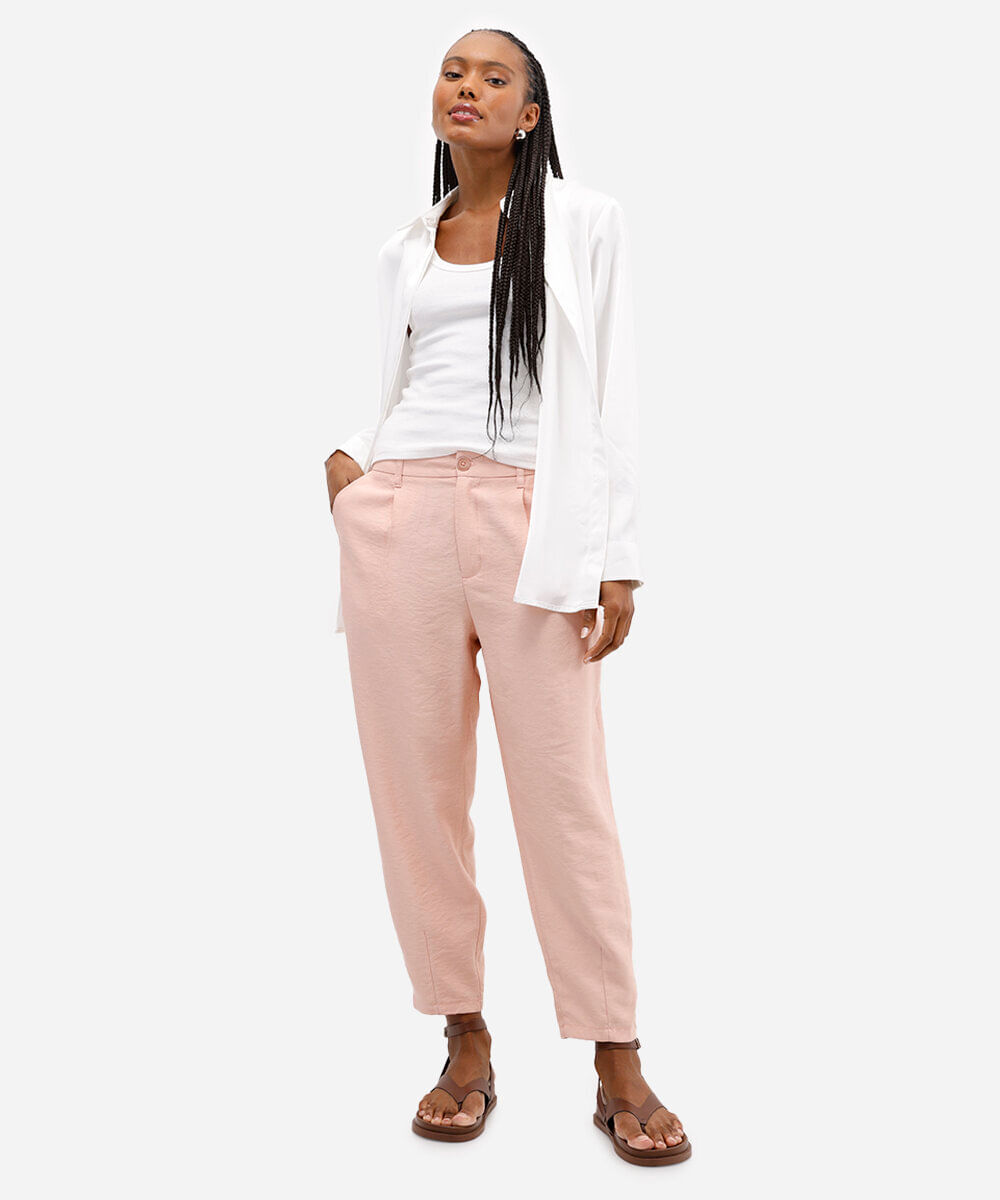 • Modelagem carrot com cintura alta, que tem o comprimento mais curto, acima do tornozelo.