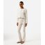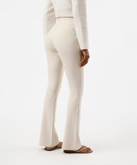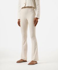 Calça feminina confeccionada em malha com viscose. A peça tem a modelagem flare, com construção reta e o caimento ajustado e barras amplas. O modelo tem cintura alta, cós com elástico embutido. Possui acabamento pespontado nas barras.