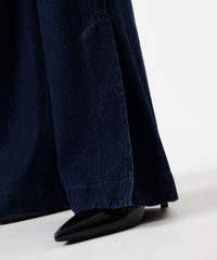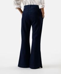 Calça feminina confeccionada em jeans. A peça tem a modelagem flare, com caimento ajustado e barras amplas com fendas laterais. O modelo tem cintura alta, cós com passantes para cinto e fechamento por botão e zíper. Possui dois bolsos na parte frontal, dois decorativos na parte posterior e acabamento pespontado nas barras.