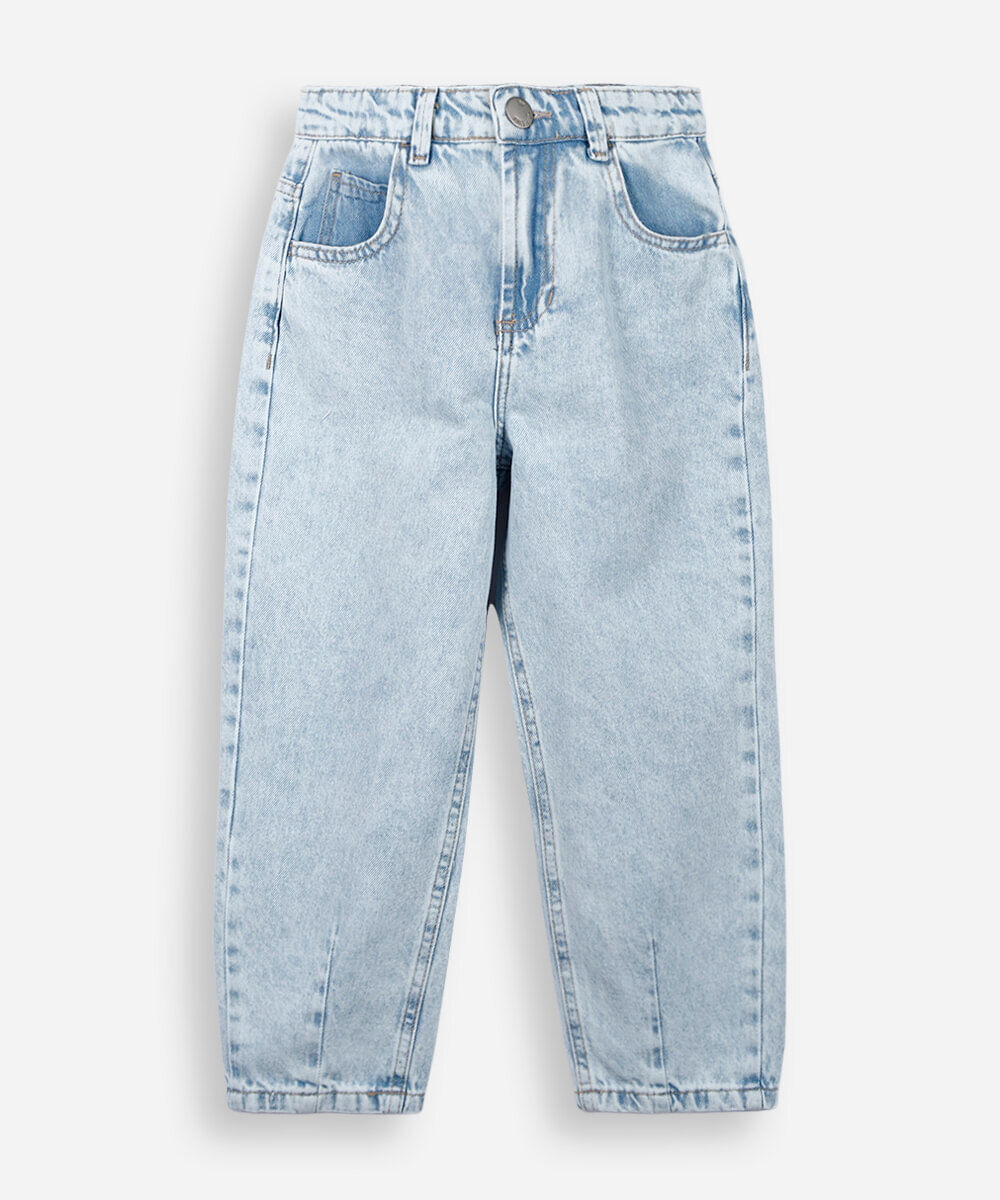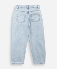 Calça infantil confeccionada em jeans com lavagem clara. A peça modelo balloon possui cintura alta, cós com passantes aplicados, elástico internos para melhor ajuste na cintura, bolsos frontais e posteriores, caimento solto e confortável ao corpo, detalhe de prega aplicada na barra, acabamento pespontado e fechamento frontal por zíper e botão. Composição: 100% algodão Instruções de lavagem: - Lavar à temperatura máxima de 40ºC - Proibido o alvejamento - Secagem mecânica à temperatura baixa - Secagem em varal - Passar à temperatura média - Não lavar à seco - Não limpar à úmido