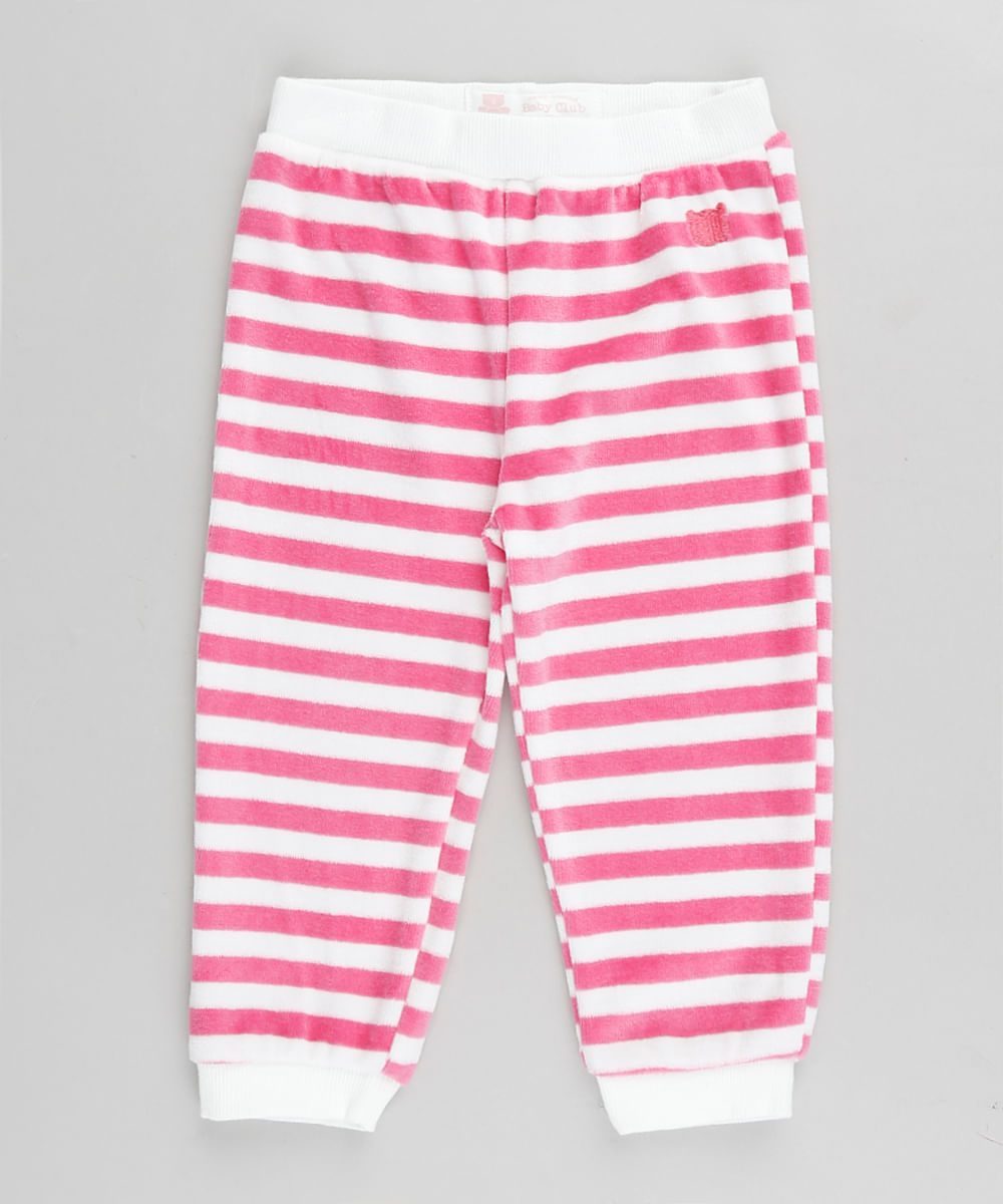 Calça infantil feminina confeccionada em plush, um material macio com toque aveludado. Tem estampa listrada. O cós possui elástico embutido. A barra tem acabamento canelado.