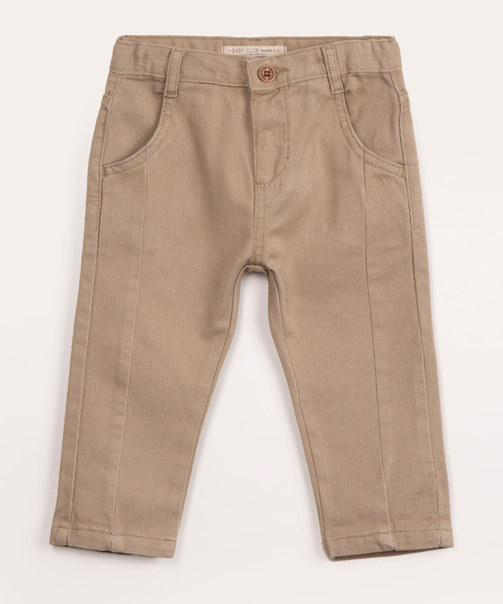 Calça confeccionada em sarja. A peça possui cós com passantes aplicados, elásticos com botões para ajuste interno, dois bolsos frontais e dois posteriores. Caimento reto, detalhe em recortes frontais, comprimento longo e acabamento pespontado. Fechamento frontal por zíper e botão.