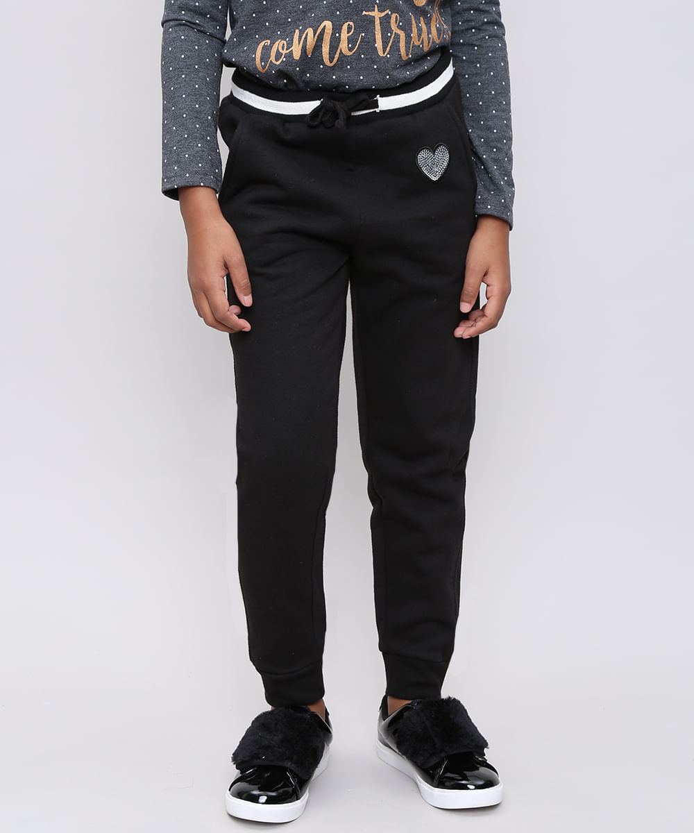 Calça infantil feminina confeccionada em moletom com forro felpado. A parte frontal tem dois bolsos e coração bordado em paetês. O cós é listrado com elástico e cordão de ajuste embutidos. A barra tem acabamento em punho.