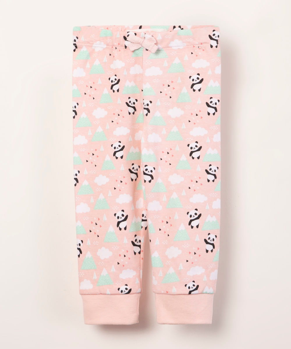 Calça infantil feminina confeccionada em malha de algodão com estampa de panda. A modelagem é reta com barras levemente ajustadas em ribana. O cós tem elástico embutido e laço decorativo.