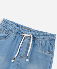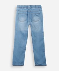 Calça infantil confeccionada em malha de algodão com efeito jeans. A peça possui modelo slim, caimento confortavelmente ajustado ao corpo, cintura alta, cós elástico com cordão embutido, bolsos frontais e posteriores e acabamento pespontado.