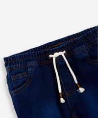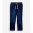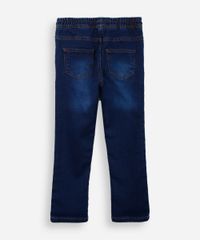 Calça infantil confeccionada em malha de algodão com efeito jeans. A peça possui modelo slim, caimento confortavelmente ajustado ao corpo, cintura alta, cós elástico com cordão embutido, bolsos frontais e posteriores e acabamento pespontado.