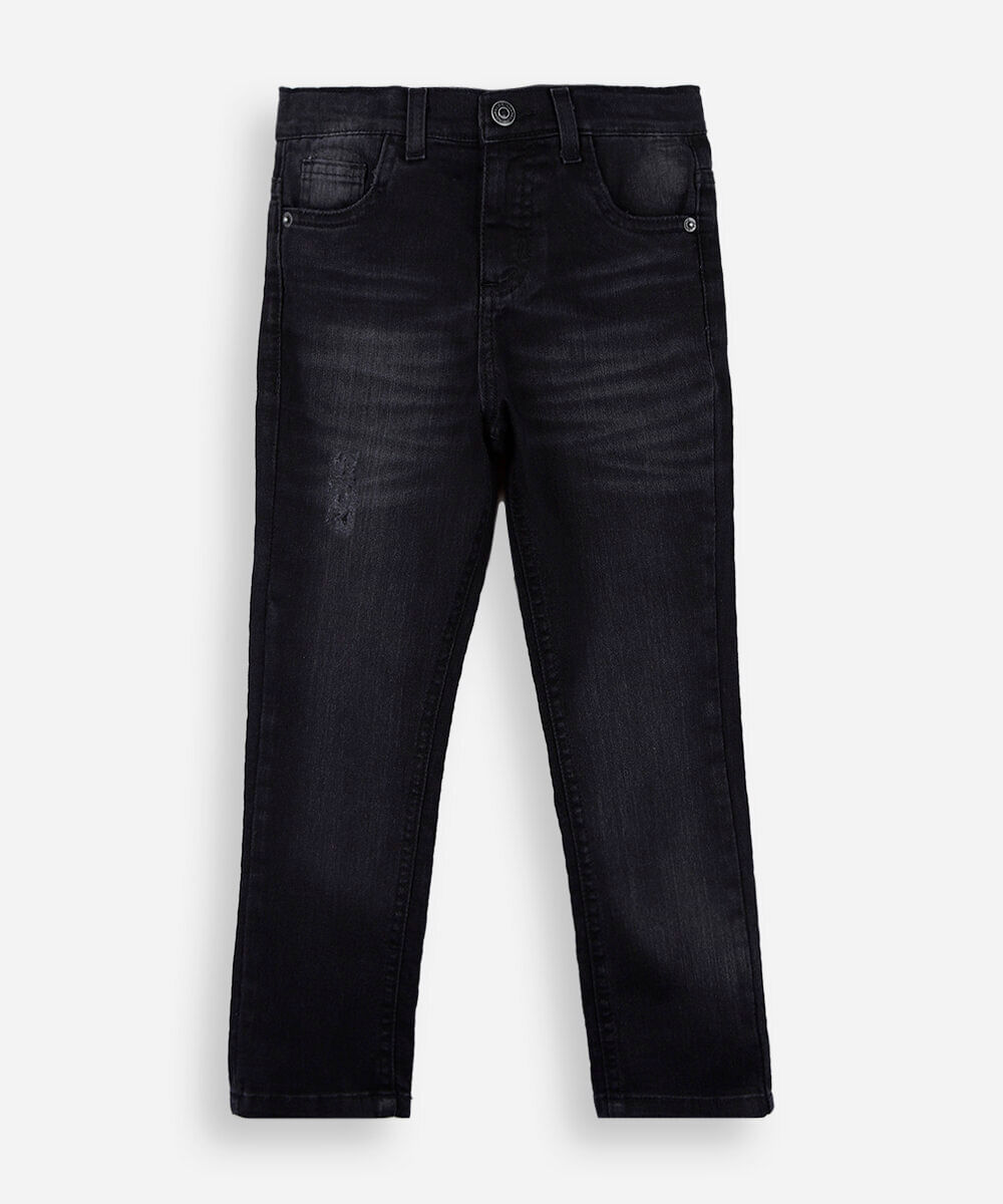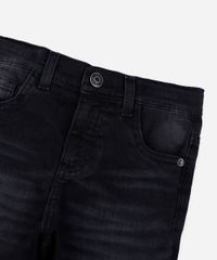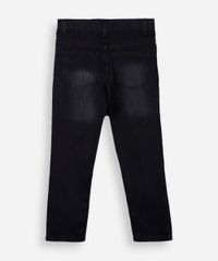 Calça infantil confeccionada em sarja jeans. A peça modelo skinny possui cintura alta, cós com passantes aplicados, elástico internos para melhor ajuste na cintura, bolsos frontais e posteriores, caimento justo e confortável ao corpo, acabamento pespontado e fechamento frontal por zíper e botão.