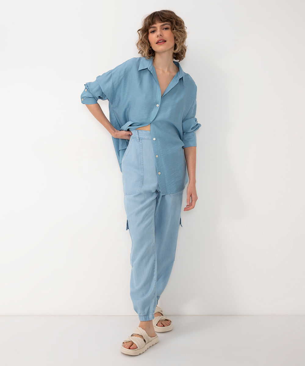 • Confeccionada em jeans leve 100% liocel, proporcionando toque macio e excelente caimento.
