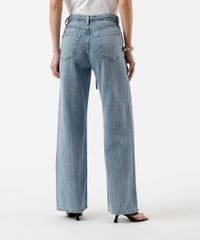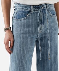 Calça feminina confeccionada em jeans de algodão. Possui modelagem oversized, caimento solto ao corpo, cintura alta, cós com passantes aplicados, três bolsos frontais e dois bolsos posteriores, detalhes com listras verticais em toda a peça, acabamento pespontado e fechamento frontal com botão e zíper. Acompanha cordão para amarração.