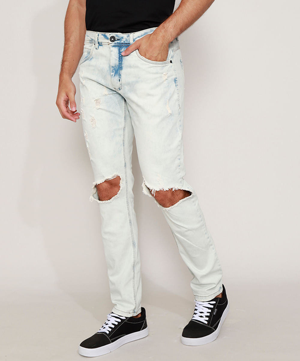 Calça masculina desenvolvida em jeans com leve elasticidade e lavagem marmorizada. A modelagem skinny tem caimento ajustado ao corpo. A parte frontal tem três bolsos e a posterior tem dois. O cós tem passantes e fechamento por botão e zíper. Tem detalhe de rasgos e puídos.