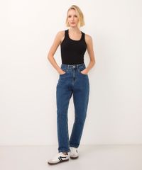 • Modelagem mom, com caimento mais solto no quadril e pernas que afunilam suavemente até o tornozelo.