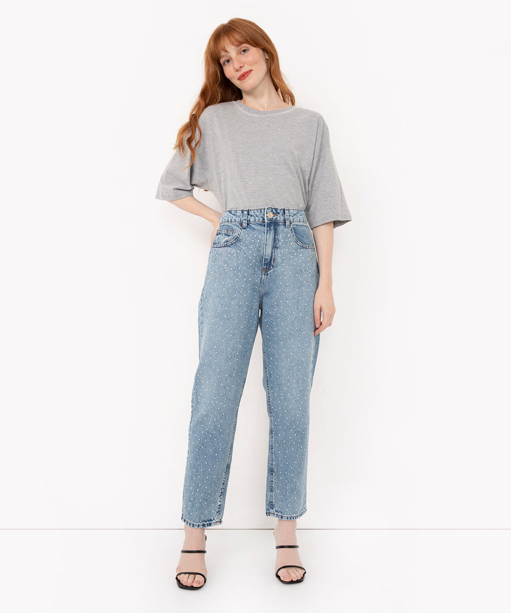 Combine o conforto do jeans com um toque de glamour nesta calça mom. Com modelagem soltinha e cintura super alta, esta peça é perfeita para quem busca estilo sem abrir mão do bem-estar. Confeccionada em jeans 100% algodão, ela tem um caimento estruturado e é finalizada com aplicações de brilho que elevam qualquer produção.