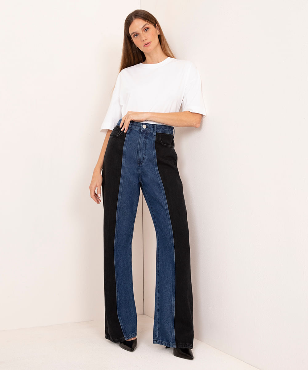 Renove seu visual com esta calça jeans cheia de personalidade. Com um design moderno que combina duas lavagens de jeans, esta peça é perfeita para quem busca um item statement para compor looks autênticos. A modelagem reta de cintura alta oferece um caimento confortável e elegante, sendo uma escolha versátil para diversas ocasiões.