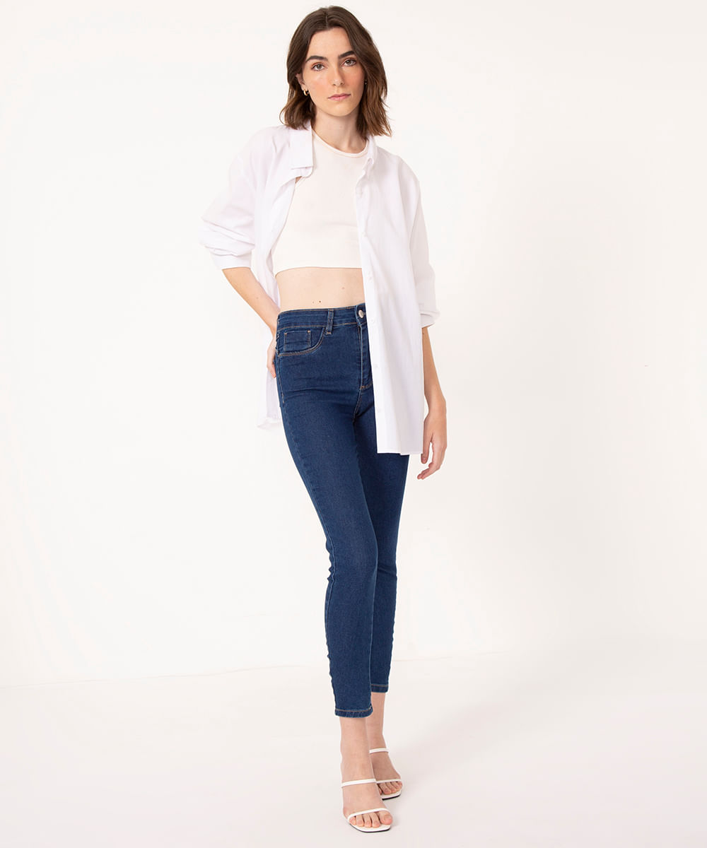 Calça confeccionada em jeans. A peça modelo skinny possui cintura alta, cós com passantes aplicados, três bolsos frontais e dois bolsos posteriores. Comprimento longo, caimento ajustado ao corpo e acabamento pespontado. Fechamento frontal por zíper e botão.