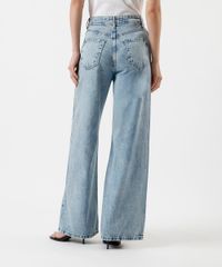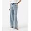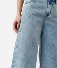 Calça jeans feminina confeccionada em jeans de algodão. Possui modelagem wide leg, cintura alta, cós com passantes aplicados, três bolsos frontais e dois bolsos posteriores, detalhes com brilhos aplicados na parte frontal da calça, fechamento com botão e zíper e acabamento pespontado.