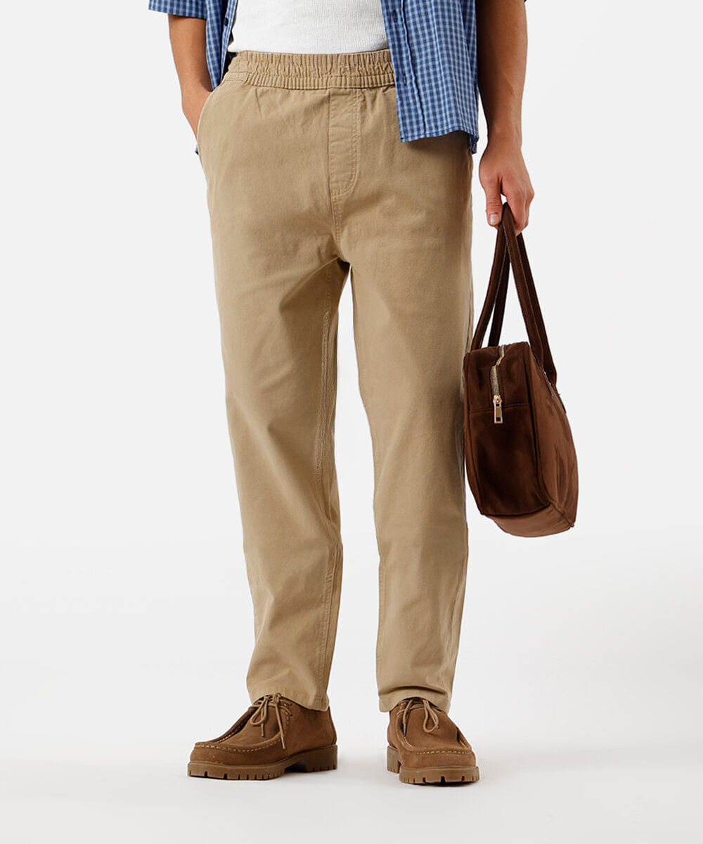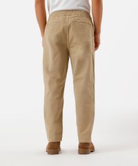 Calça masculina confeccionada em sarja com elasticidade. A peça tem a modelagem jogger, com construção afunilada e o caimento confortavelmente solto ao corpo. O modelo tem cintura média, cós com elástico embutido e cordão para ajuste. Possui dois bolsos na parte frontal e dois embutidos na parte posterior. Detalhe de acabamento pespontado nas barras.