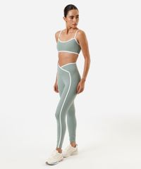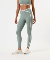Calça feminina confeccionada em malha de poliamida. A peça tem a modelagem legging, com construção afunilada e o caimento justo ao corpo. O modelo tem cintura alta e cós largo com efeito transpassado. Possui viés contrastante aplicado e acabamento pespontado nas barras.