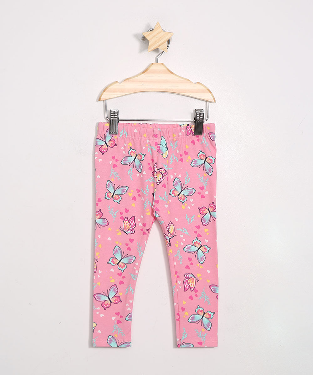 Calça infantil feminina desenvolvida em malha de algodão com elasticidade e aplicação de glitter. Possui estampa de borboletas, folhas e corações coloridos. O cós tem elástico embutido e o caimento é ajustado ao corpo.