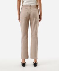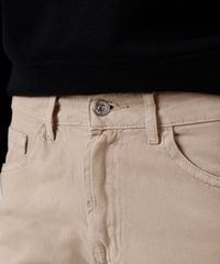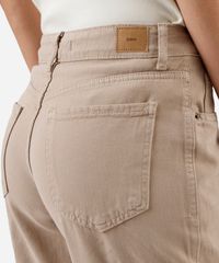 Calça feminina confeccionada em sarja. A peça tem a modelagem mom, com construção afunilada e o caimento solto ao corpo. O modelo tem cintura alta, cós com passantes para cinto e fechamento frontal por botão e zíper. Possui três bolsos na parte frontal e dois aplicados na parte posterior. Detalhe de acabamento pespontado nas barras.