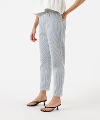 Calça feminina confeccionada em sarja com estampa listrada. A peça tem a modelagem mom, com construção afunilada e o caimento é confortavelmente solto ao corpo. O modelo tem cintura alta, cós com passantes para cinto e fechamento frontal por botão e zíper. Possui três bolsos na parte frontal e dois aplicados na parte posterior. Detalhe de acabamento pespontado nas barras.