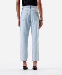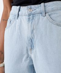 Calça feminina confeccionada em jeans. A peça tem a modelagem mom, com construção afunilada e caimento solto ao corpo. O modelo tem cintura alta, cós com passantes e fechamento por botão e zíper. Possui três bolsos na parte frontal e dois aplicados na parte posterior. Detalhe de acabamento em pesponto contrastante