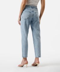 Calça feminina confeccionada em jeans estruturado com aplicação de brilhos na parte frontal. A peça tem a modelagem mom, com construção afunilada e o caimento é confortavelmente solto ao corpo. O modelo tem cintura alta, cós com passantes para cinto e fechamento frontal por botão e zíper. Possui três bolsos na parte frontal e dois aplicados na parte posterior. Detalhe de acabamento pespontado nas barras.