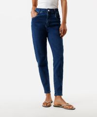 • Modelagem mom com cintura alta e perna afunilada, um design clássico e confortável.