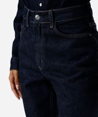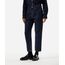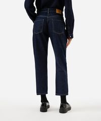 Calça feminina confeccionada em jeans com lavagem escura. A peça possui modelo mom, cintura super alta, cós com passantes aplicados, bolsos frontais e posteriores, caimento reto, levemente solta no quadril e pernas, acabamento pespontado e fechamento frontal por zíper e botão.